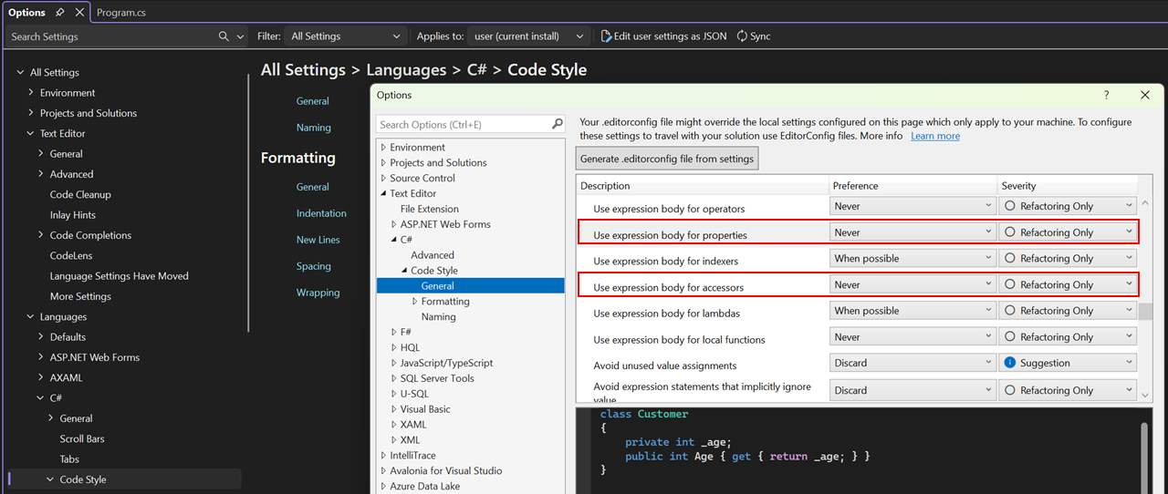 Wil je toch je autoproperties omzetten naar full properties volgens de "klassieke" syntax die we hier uitleggen, ga dan naar je instellingen. Tools->Options->Text Editor->C#->Code Style->General->Expression Preferences. Zet daar de items *Use expression body for accessors* en *Use expression body for properties* op "Never".